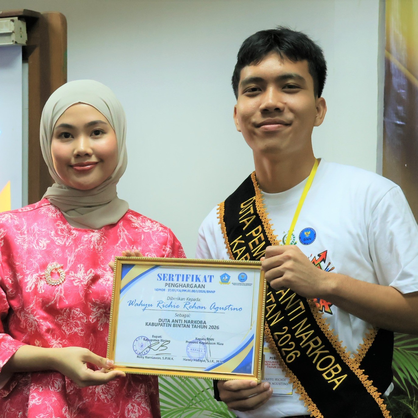 kepada Duta Pemuda Anti Narkoba Kabupaten Bintan Tahun 2026, Selasa (27/1/2026), bertempat di De Bintan Villa