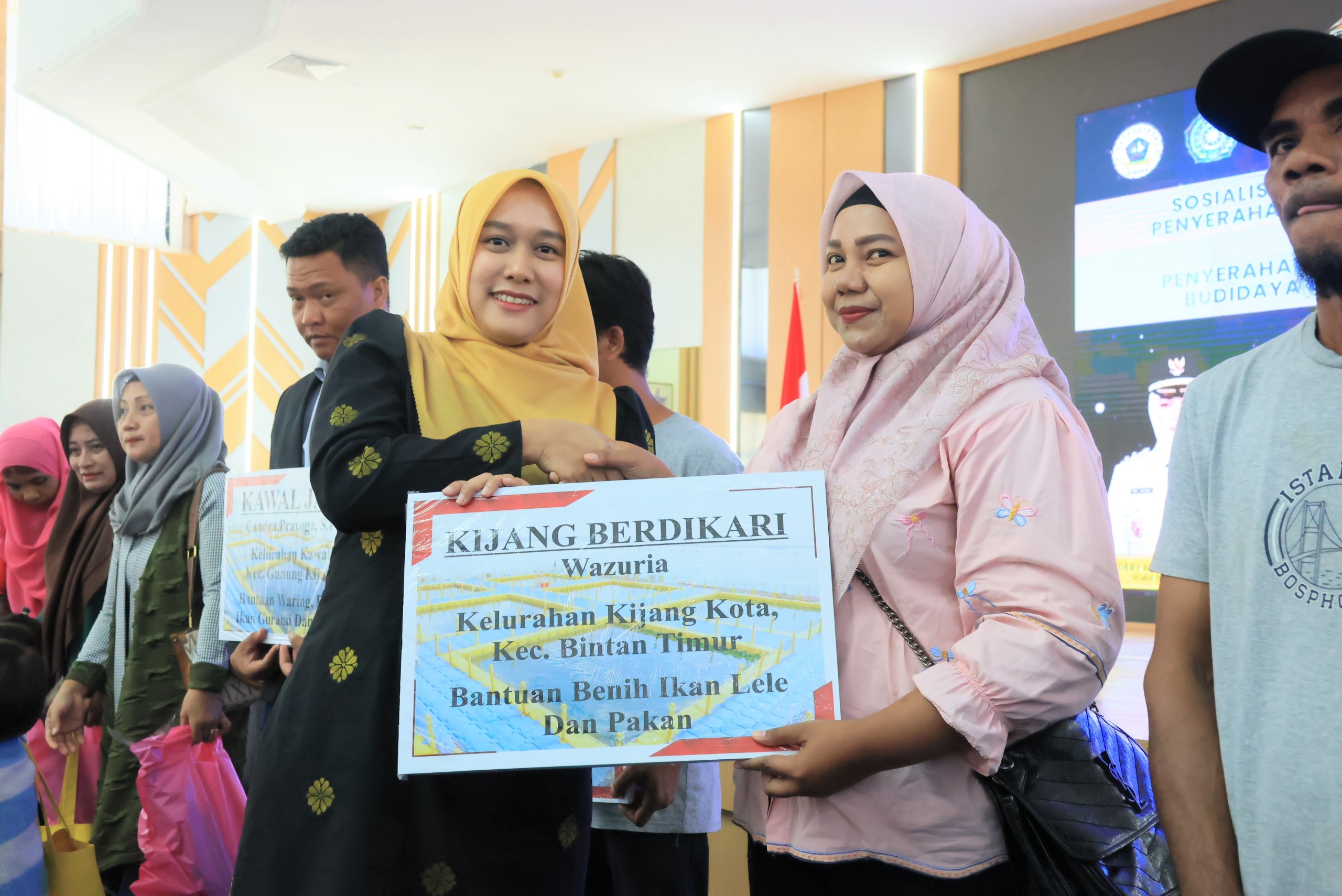 Wakil Bupati Deby serahkan banruan bibit Ikan lele dan pakan,Jumat (5 /12), di Aula Kantor Bupati Bandar Seri Bentan.