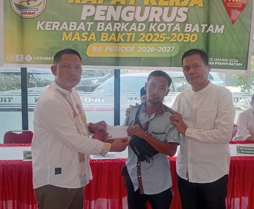Penyerahan santunan dilakukan secara simbolis di sela-sela Rapat Kerja (Raker) Pengurus KERABAT–BARKAD, yang berlangsung di ruang VIP Rumah Makan Tigo Sambilan, Bengkong, Minggu (25/8/2026).