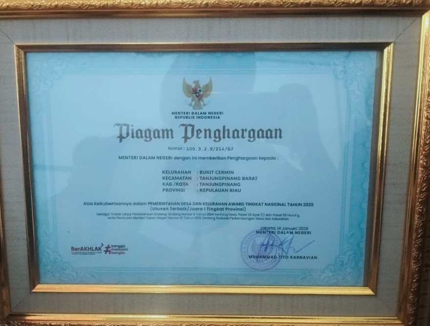 “Penghargaan ini adalah hasil kerja kolektif seluruh perangkat kelurahan, dukungan Pemerintah Kota Tanjungpinang, pembinaan dari Pemerintah Provinsi Kepulauan Riau, serta partisipasi aktif masyarakat Bukit Cermin. Kami bersyukur dapat membawa nama daerah hingga ke tingkat nasional,” ujar Ima Rosida.
