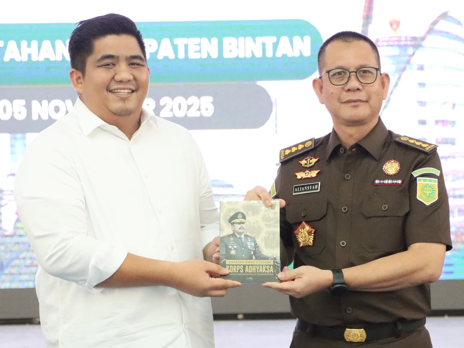 Kabid Penerangan dan Penyuluhan Puspenkum Kejagung RI, Dr. Aliansyah memberikan plakat kepada Bupati Roby Rabu (5/11) di Aula Bandar Seri Bentan