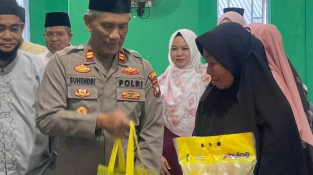 Kapolsek Daik Lingga IPTU Suhendri menyerahkan paket sembako kepada masyarakat wilayah SP III, Desa Bukit Harapan, Baca selengkapnya