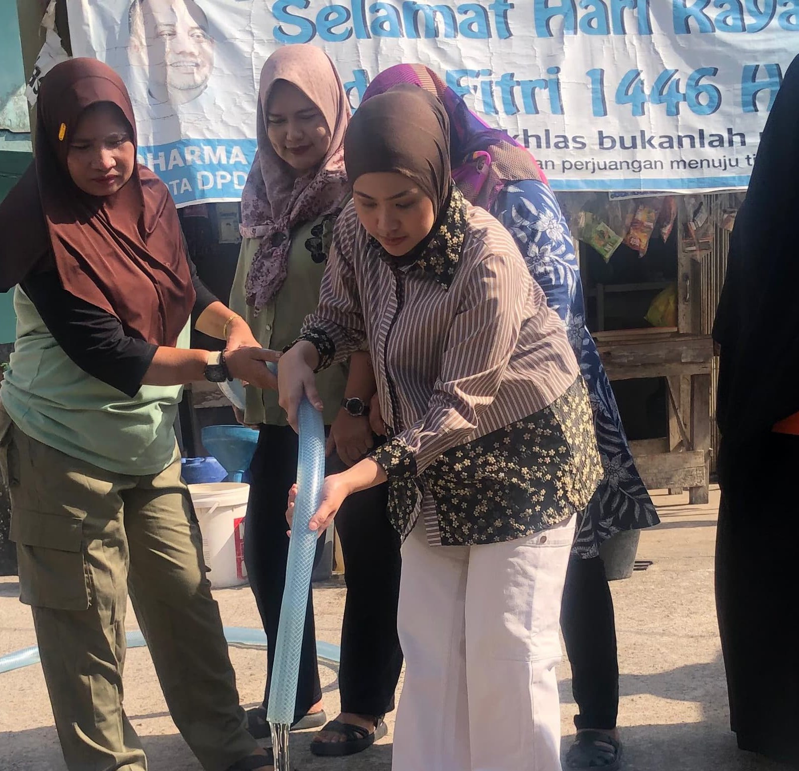 Ketua PMI Bintan Hafizha Rahmadhani turun langsung mendistribusikan air bersih di Kampung Bina Desa, Km 17, Kijang, Kecamatan Bintan Timur